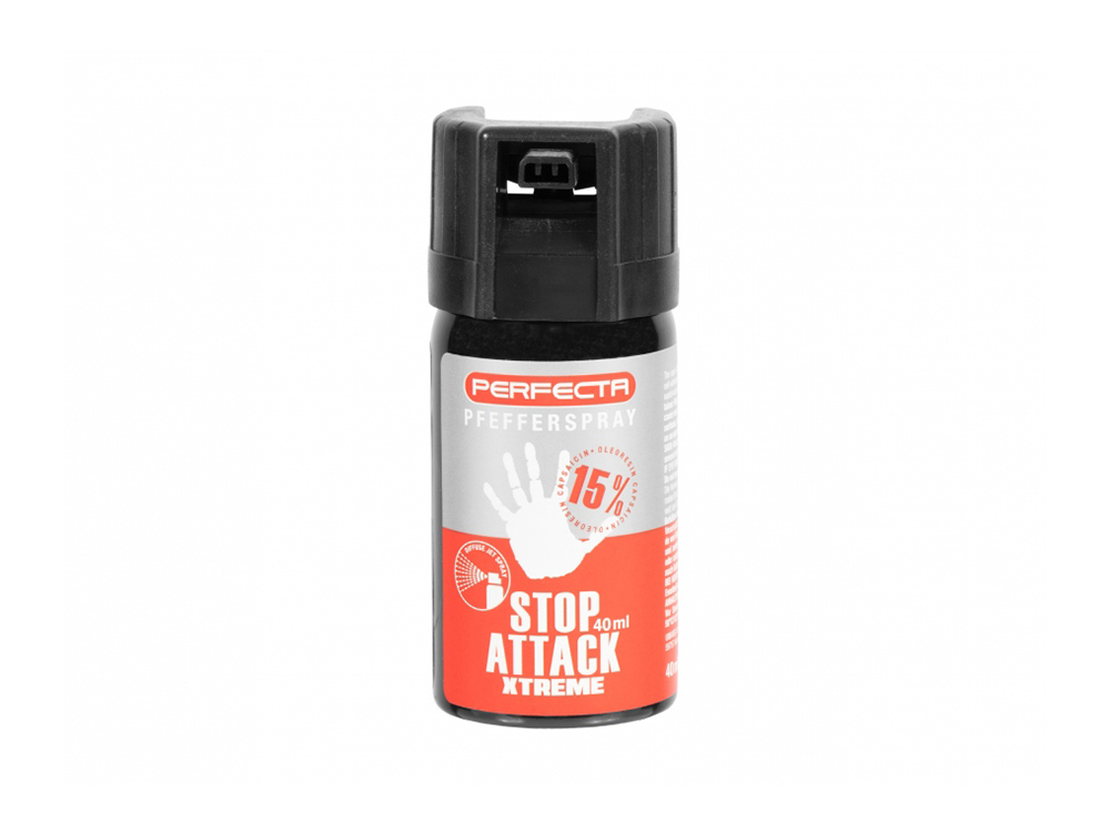 Perfecta Stop Attack Xtreme stożek 40 ml to skuteczny gaz pieprzowy o zasięgu 4 metrów, który w formie szerokiej chmury uwalnia substancję czynną o 15% stężeniu kapsaicyny.