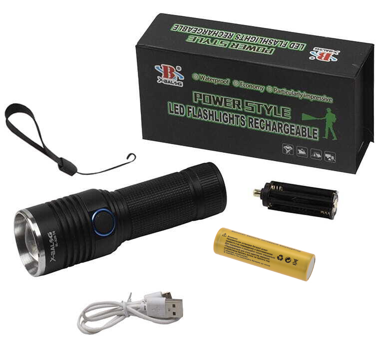 Model: X-BALOG BL-S26-T6 L-096 Rodzaj Diody: XML-T6 Długość: 130-143 mm Długość z wysuniętym zoom: 145 mm Średnica przód: 38 mm Średnica tył: 31 mm Średnica soczewki: 27 mm Obudowa: aluminium lotnicze Żywotność diody: do 100 000 godzin Funkcja zoom: tak, płynny Tryb pracy: 100%, 50%, stroboskop Zasilanie: akumulator/ogniwo 18650 3,7V-4,2V lub 3x bateria AAA (brak w komplecie) Ładowanie: micro USB Kolor: Czarny Waga z akumulatorami: 164 gram Producent: X-BALOG Kraj pochodzenia: PRC