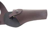 Kabura wyposażona jest w pasek z zapięciem typu nap, za pomocą którego można zablokować wewnątrz rewolwer.