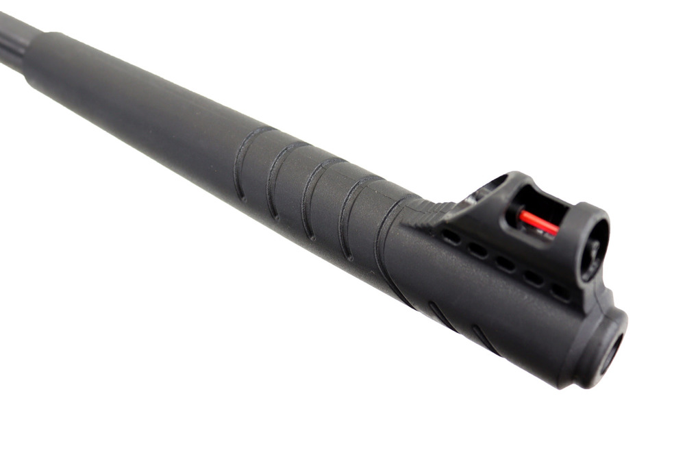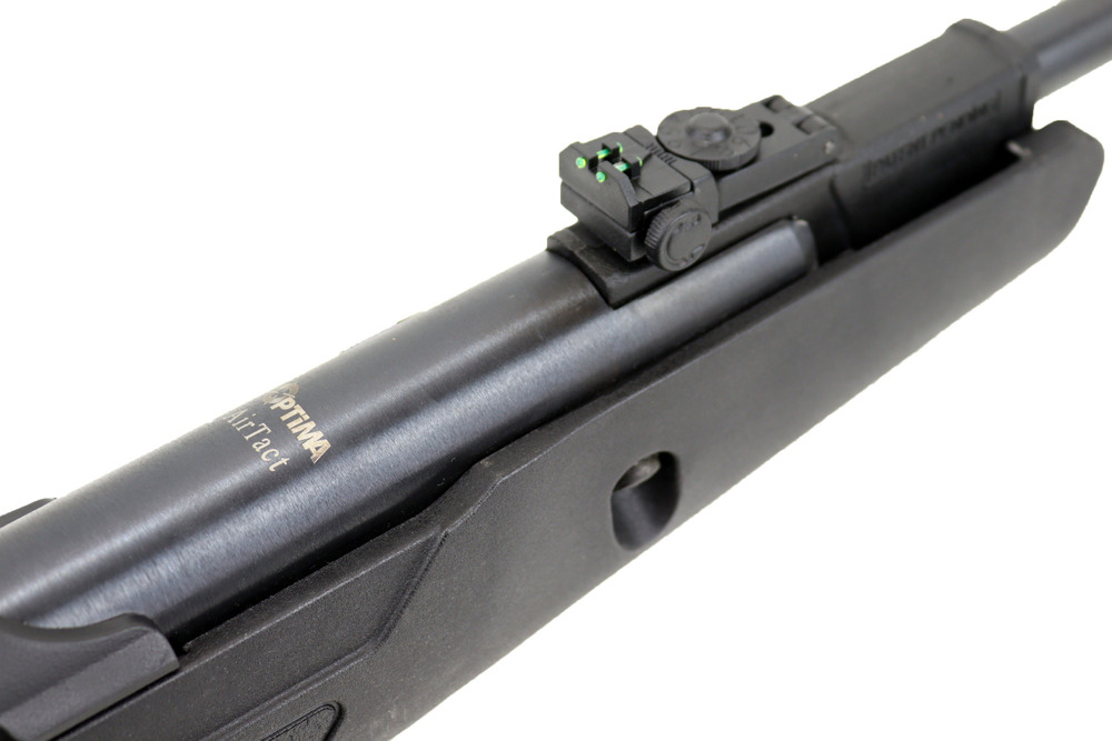 Hatsan Optima Airtact PD ma stalową gwintowaną lufę o długości 420 mm na której umieszczono muszkę światłowodową z osłoną.