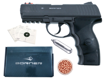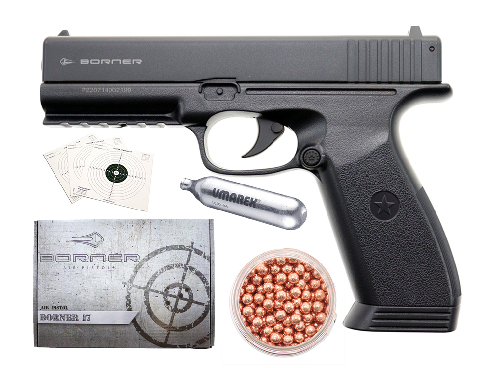 Oznaczenie prod.: Borner 17 Zasilanie: 1 x 12g nabój CO2 Kaliber: 4,5 mm (.177) Typ śrutu: Kulka stalowa BB 4,46 mm Energia początkowa: Poniżej 17 J Magazynek: 18 sztuk stalowych kulek BB's Prędkość początkowa: 120 m/s Długość całkowita: 192 mm Długość lufy: 120 mm Materiał: metal/ABS Waga: 425 gram