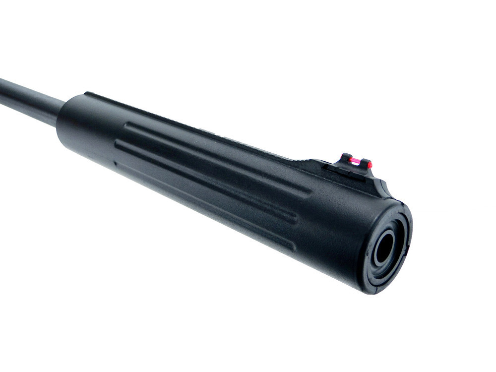 Zintegrowany tłumik - znacznie ogranicza hałas przy strzale a jednocześnie stanowi element montażu muszki dzięki czemu można strzelać z otwartych przyrządów celowniczych.