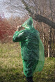 Płaszcz zakłada się przez głowę, a kaptur z regulowanym sznurkiem pozwala dostosować obwód do potrzeb użytkownika.