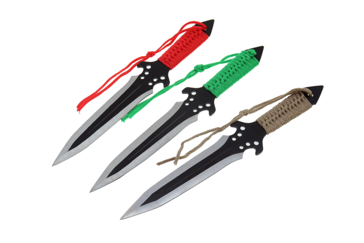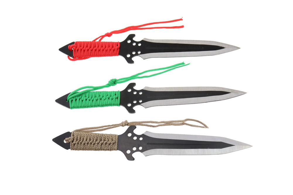Zestaw trzech dobrze wyważonych noży do rzucania, odpowiedni zarówno dla początkujących, jak i zaawansowanych użytkowników.