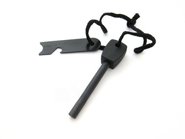 Zestaw zawiera krzesiwo magnezowe o średnicy 8 mm oraz metalową blaszkę z otwieraczem do kapsli i miarką. Dołączono także zielony gwizdek alarmowy.