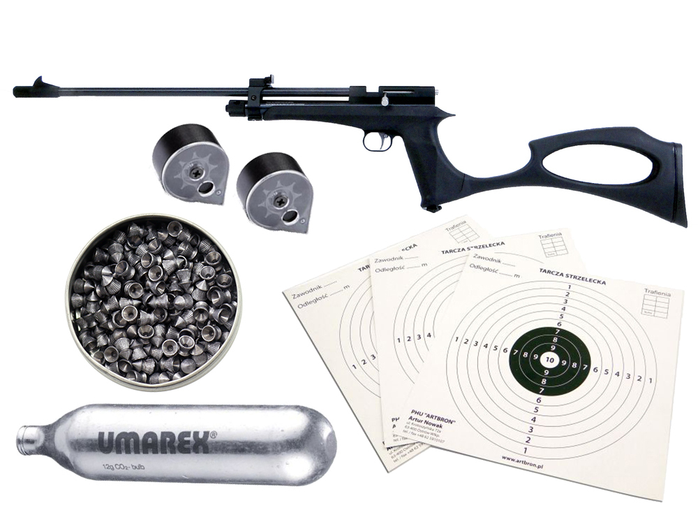 - magazynek 9-cio strzałowy 2 sztuki - tłumik - dwie lufy (pistoletowa oraz karabinkowa) - kolba karabinkowa - dwie szczerbinki - wkładka 1 strzałowa - opakowanie tarcz strzeleckich - opakowanie śrutu Diabolo - 1 nabój CO2