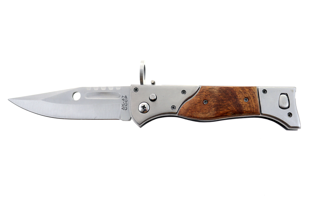 Nóż składany swoja stylistyką nawiązujący do bagnetu słynnego karabinu Kałasznikowa.