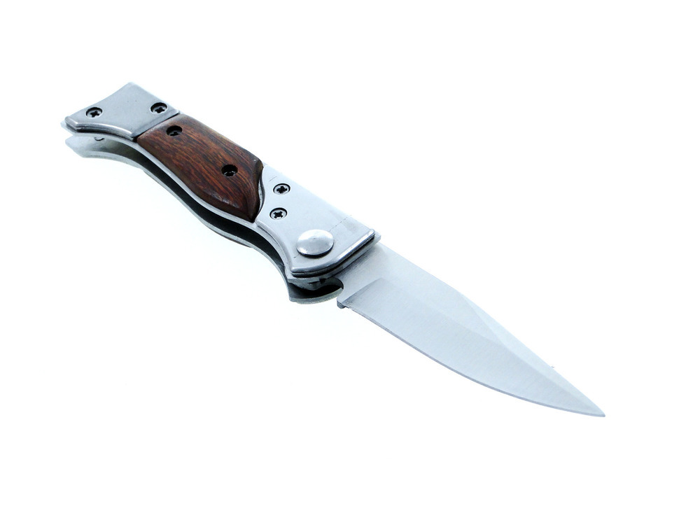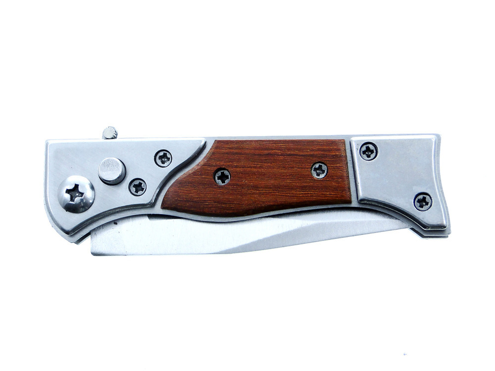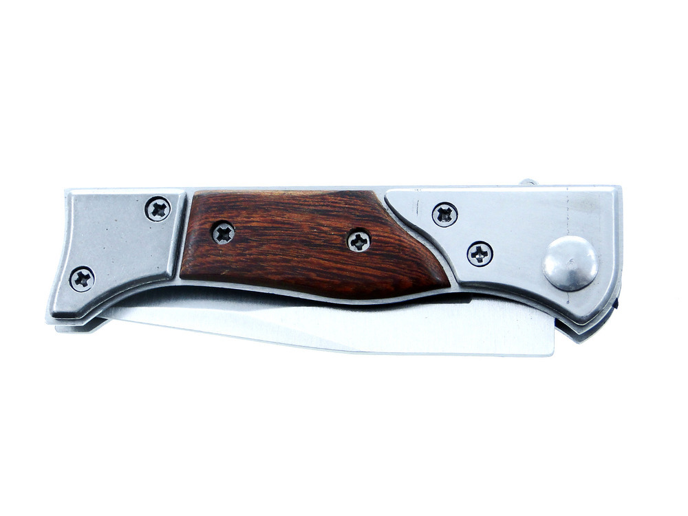 Nóż wykonany jest ze stali nierdzewnej z drewnianymi rękojeściami.