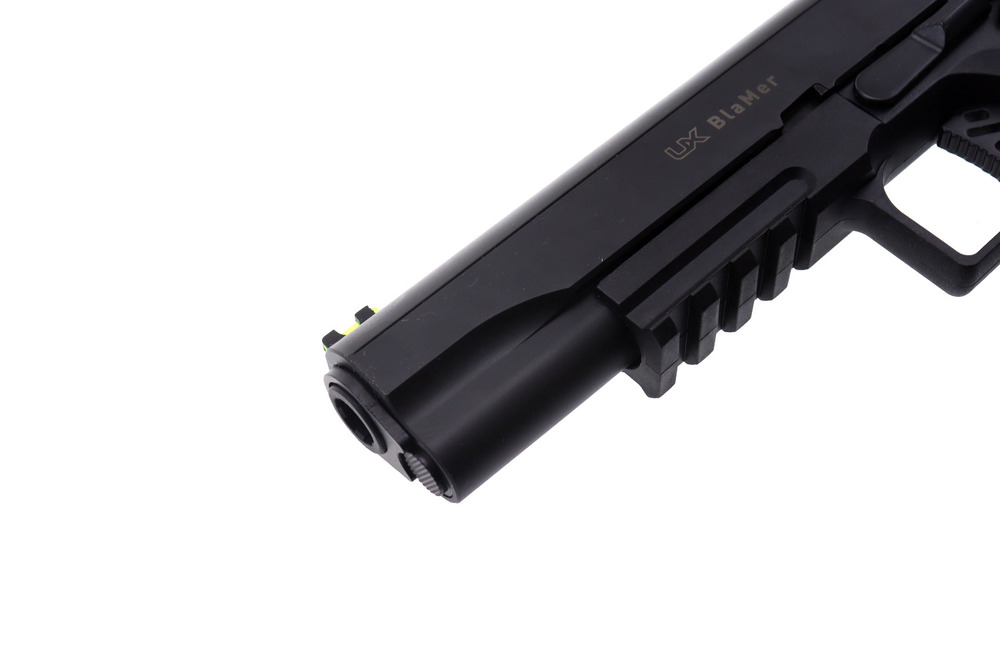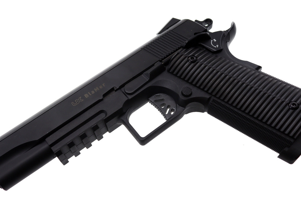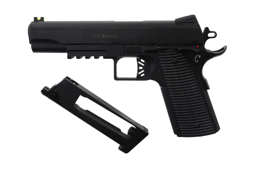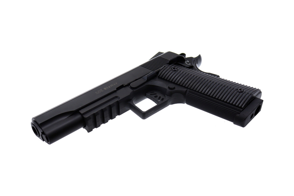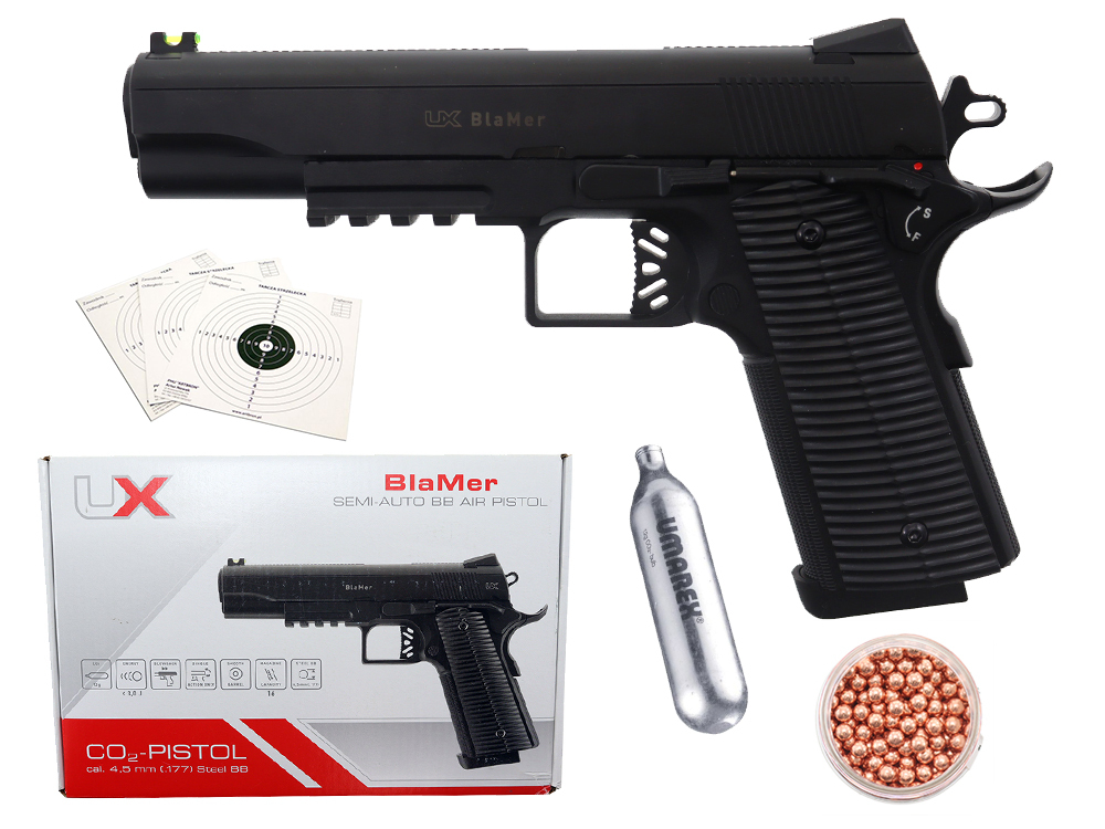 Umarex BlaMer to lekki, łatwy w obsłudze pistolet wiatrówkowy kal. 4,5 mm BB, stylistycznie nawiązujący do klasycznego Colta 1911. Zaprojektowany z myślą o rekreacyjnym strzelaniu i treningu — szczególnie polecany dla osób zaczynających przygodę ze strzelectwem. Kompaktowa polimerowa konstrukcja sprawia, że jest wygodny w użytkowaniu również przez kobiety i młodzież (pod nadzorem osoby dorosłej).