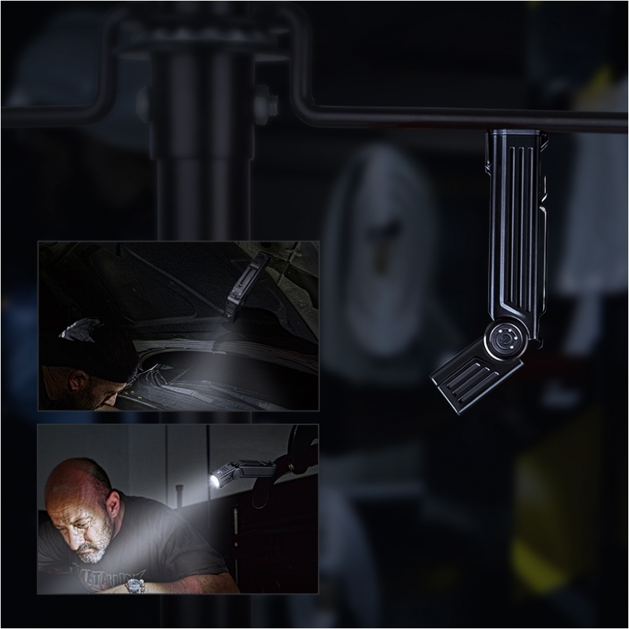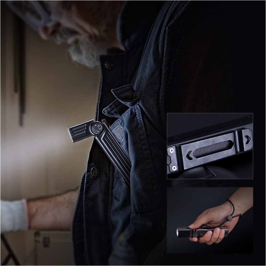 Kluczową cechą modelu WT25R jest regulowana głowica odchylana w zakresie 105°, co pozwala precyzyjnie kierować światło tam, gdzie jest potrzebne — bez konieczności zmiany uchwytu. Latarka umożliwia pracę bez użycia rąk dzięki dwóm systemom montażu: mocnemu magnesowi w podstawie oraz stalowemu klipsowi umożliwiającemu przypięcie do odzieży, kieszeni, plecaka czy ekwipunku.