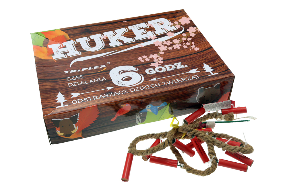 Huker to zestaw 12 petard połączonych sznurem. Po odpaleniu sznur tli się przez około 6 godzin i w odstępach około 15 do 30 minut zostaje odpalona petarda. Bardzo dobry odstraszacz na grubą zwięrzynę w miejscach w których nie mamy ciągłego dostępu jak np. oddalone pola lub łąki.
