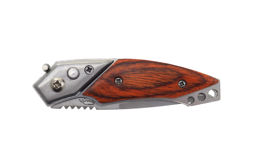 Rękojeść wykonana z metalu w połączeniu z drewnianymi wstawkami zapewnia trwałość oraz pewny, stabilny chwyt. Nóż ma długość całkowitą 14,5 cm, co gwarantuje komfort pracy przy zachowaniu kompaktowych rozmiarów.