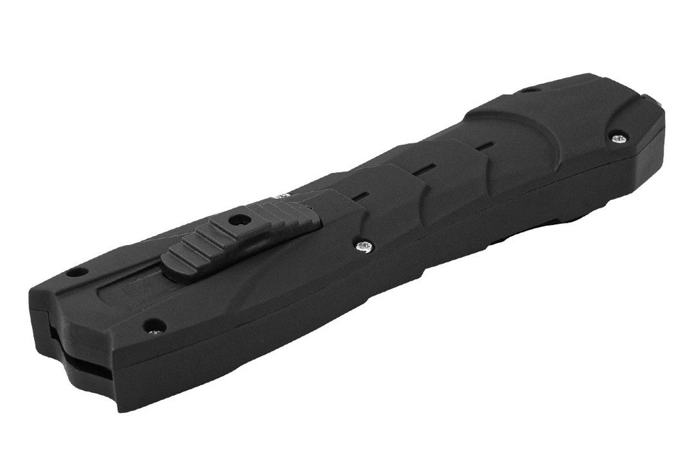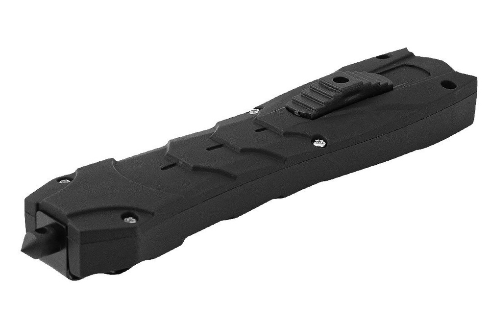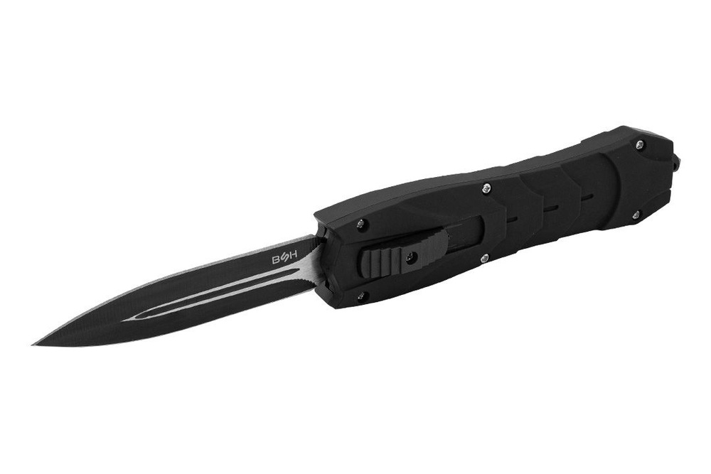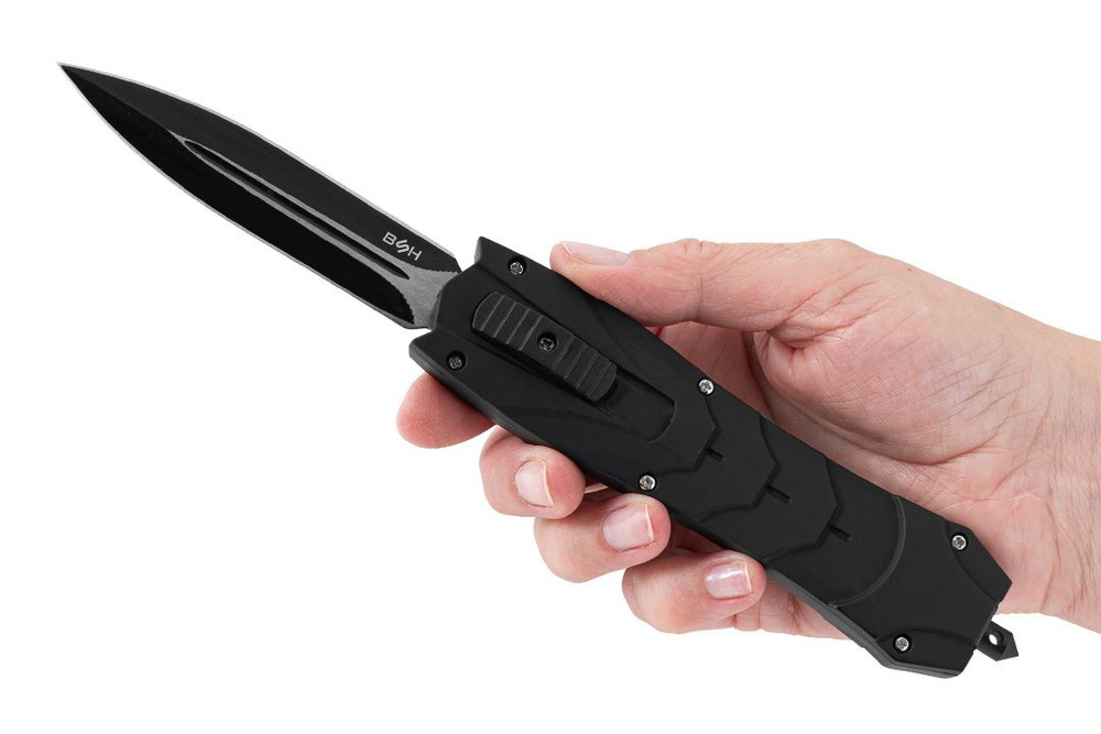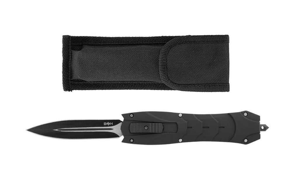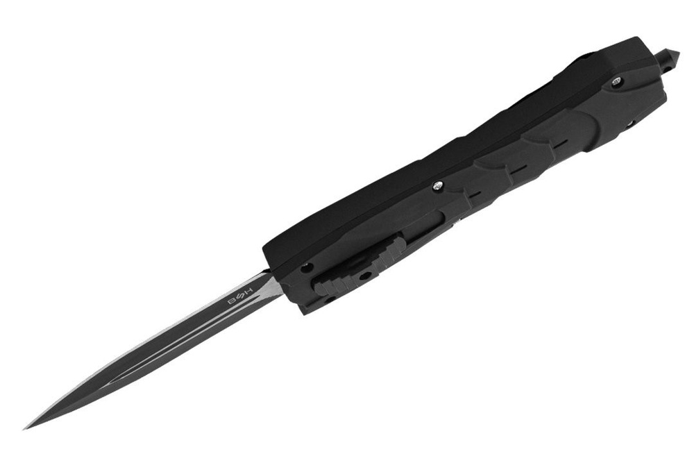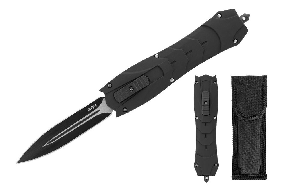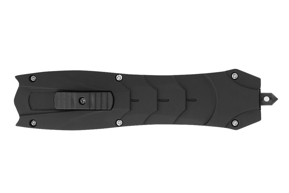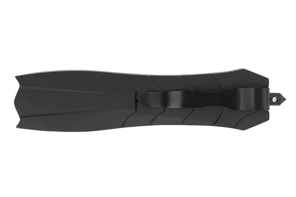 Nóż sprężynowy typu OTF (Out The Front) wyróżnia się mechanizmem automatycznego wysuwania i chowania ostrza z przodu rękojeści, co gwarantuje błyskawiczne działanie i pełną kontrolę. Głownia typu dagger (sztylet) o podwójnym ostrzu doskonale sprawdza się przy precyzyjnych cięciach, a czarne wykończenie nadaje nożowi nowoczesny i taktyczny charakter.