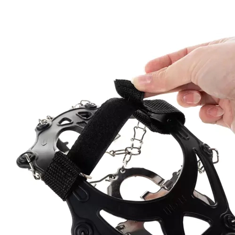 Wyposażone w nierdzewne łańcuszki i kolce ze stali, są odporne na korozję i zapewniają pewny chwyt nawet na twardym, zlodzonym podłożu. Wzmocniona podpiętka zwiększa stabilność, szczególnie przy schodzeniu z pochyłości, a zawiasowe przodostopie ułatwia naturalne poruszanie się.