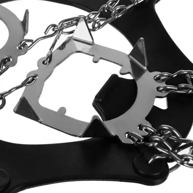 kolor: czarno / srebrne materiał: stal nierdzewna, pozostałe: TPE + nylon + pokrowiec: materiał: poliester, pozostałe: żywica + stop cynku ilość zębów w 1 raku: 12 rozmiar: L 40-44 grubość gumy utrzymującej łańcuchy: 0,4 cm wysokość kolca: 1,7cm wymiary etui: 13/18/5 cm waga: 426 gram waga z opakowaniem: 435 gram