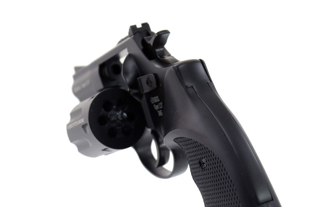 Okładziny rękojeści wykonane z wytrzymałego tworzywa ABS zostały zaprojektowane ergonomicznie, zapewniając wygodne i pewne trzymanie rewolweru.
