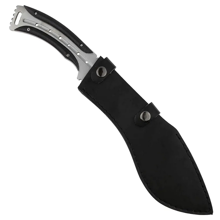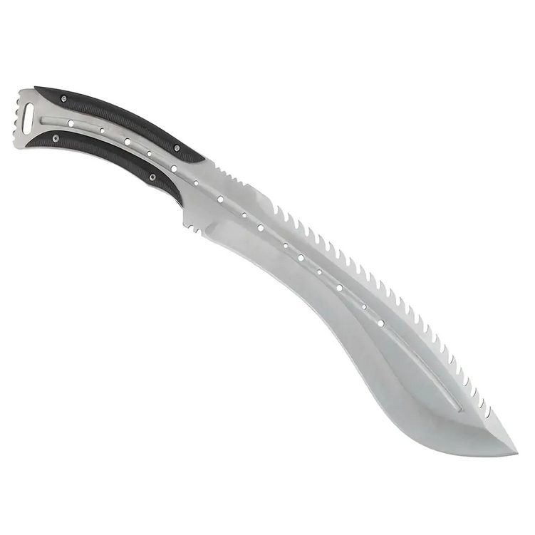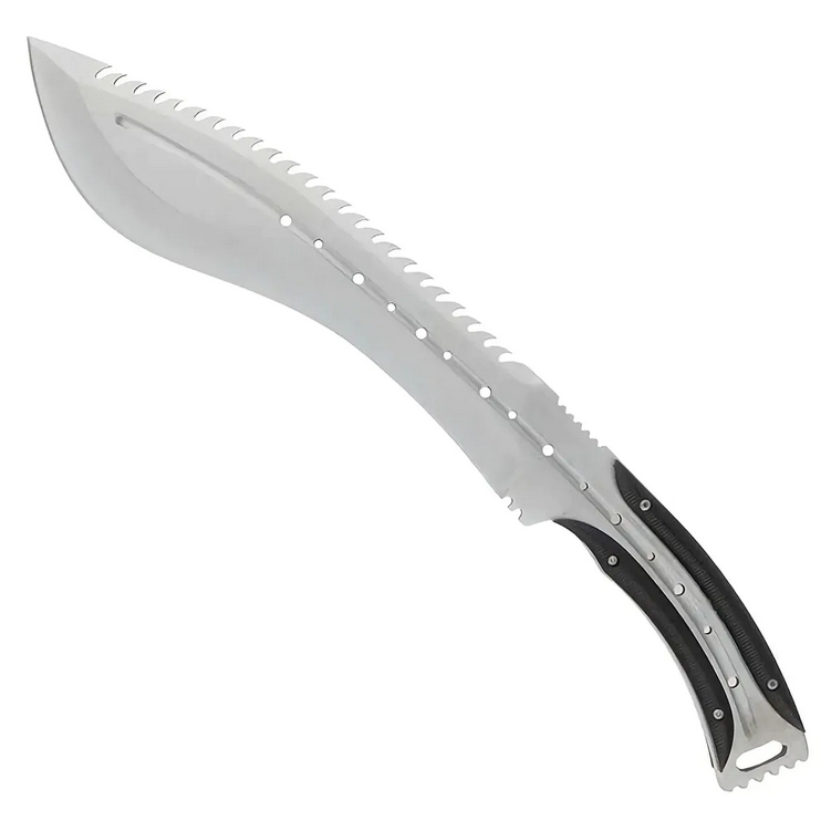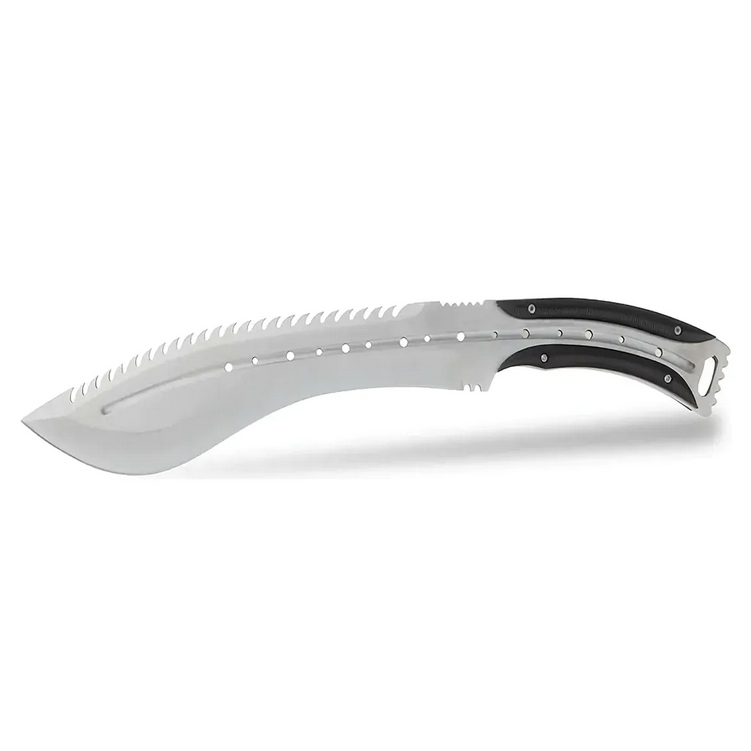 Wykonana ze stali nierdzewnej, posiada zakrzywioną głownię z falowanym ostrzem, które skutecznie radzi sobie z cięciem i rąbaniem. Ząbkowany grzbiet umożliwia dodatkowo piłowanie, zwiększając uniwersalność narzędzia. Profil kukri zapewnia dużą siłę uderzenia i wysoką efektywność pracy.