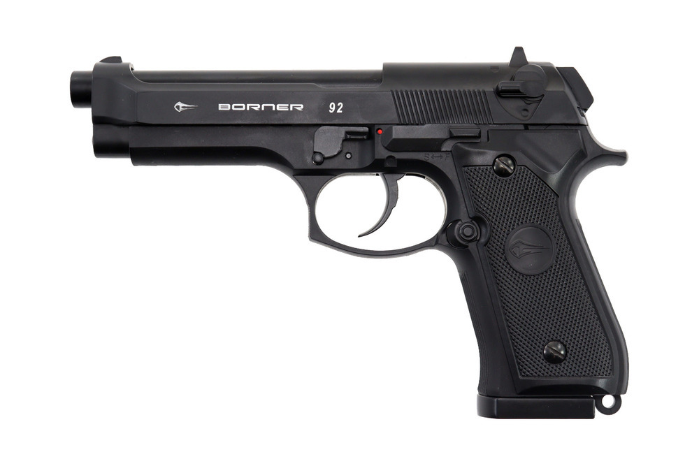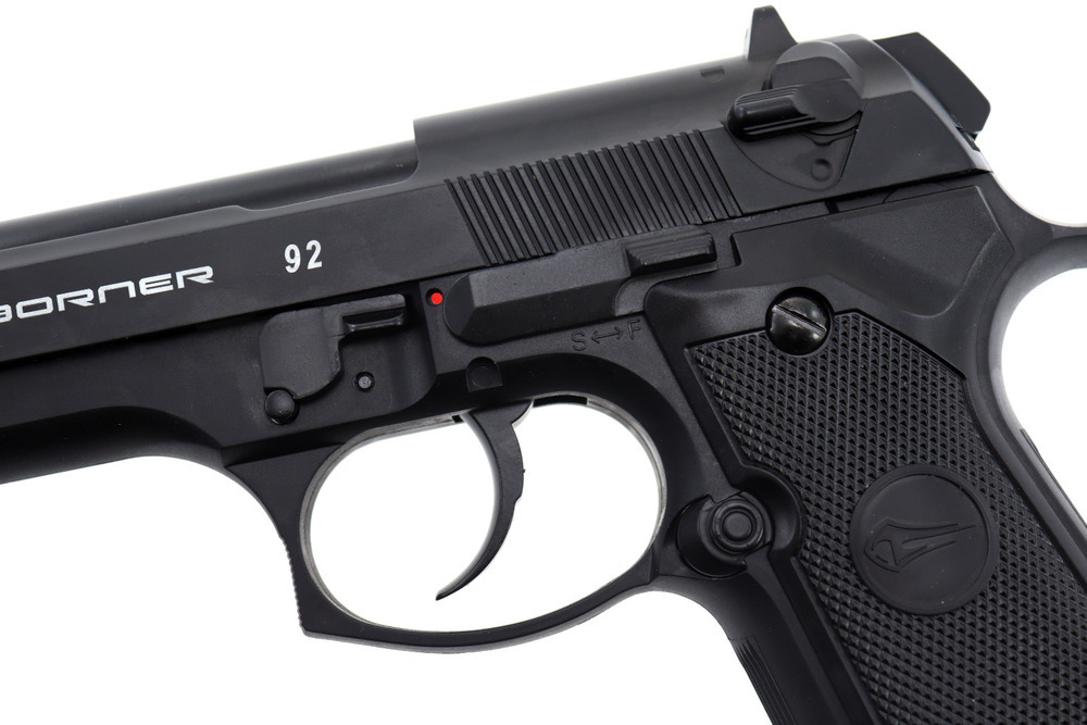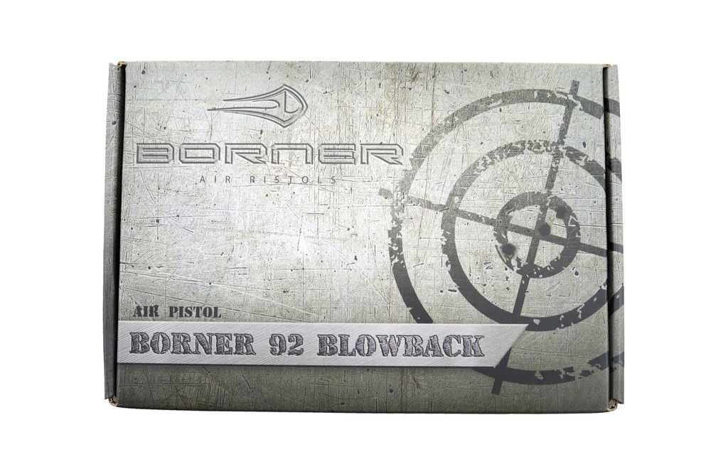 Oznaczenie prod.: Borner 92 Blowback Zasilanie: 1 x 12g nabój CO2 Kaliber: 4,5 mm (.177) Lufa gwintowana Typ śrutu: Kulka stalowa BB 4,46 mm lub Diabolo 4.5 mm Energia początkowa: Poniżej 17 J Pojemność magazynka: 8 sztuk Prędkość początkowa: 110 m/s Długość całkowita: 220 mm Materiał: metal Waga: 990 gram