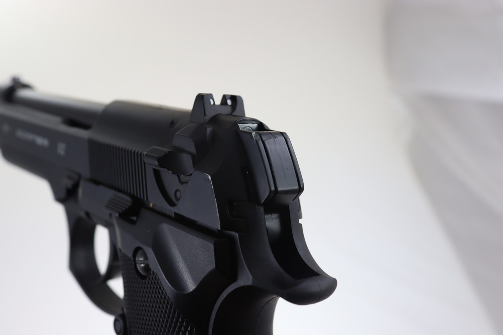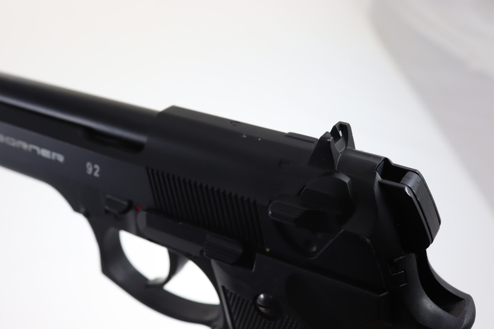 Pistolet posiada klasyczne otwarte przyrządy celownicze bez możliwości ich regulacji. Z lewej strony pistoletu znajduje się bezpiecznik blokady spustu. Całość bardzo ładnie i solidnie wykonana z metalu.