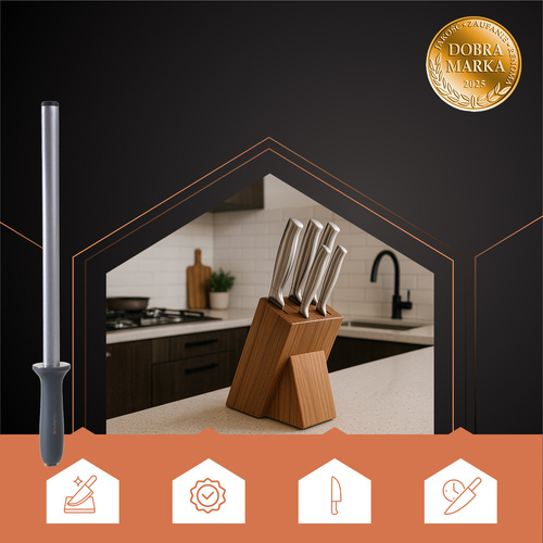 Element ostrzący o długości 30 cm sprawdzi się zarówno przy krótkich, jak i długich nożach kuchennych. Rdzeń wykonany ze stali nierdzewnej oraz trwała powłoka szmerglowa gwarantują wysoką wytrzymałość i odporność na korozję. Ergonomiczny, antypoślizgowy uchwyt z tworzywa PP zapewnia pewny chwyt i pełną kontrolę podczas ostrzenia.