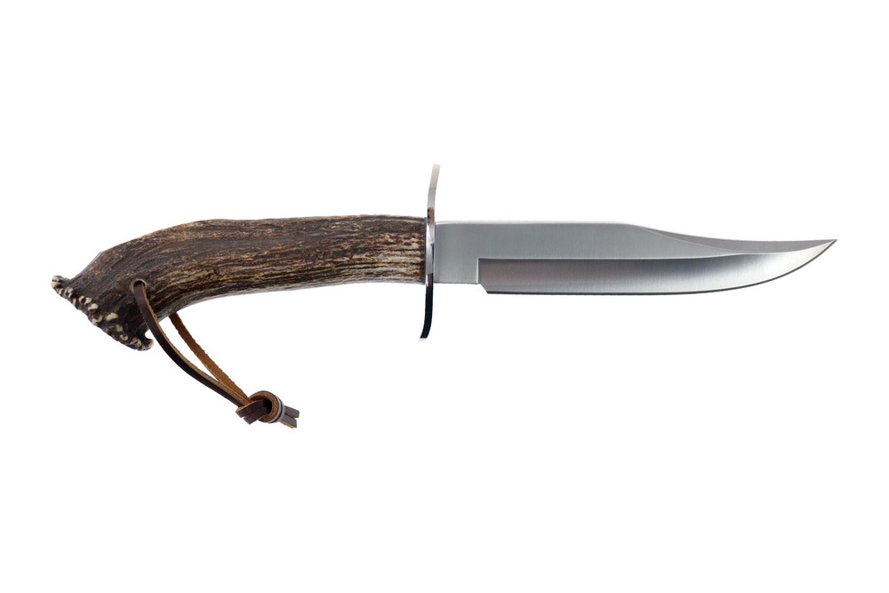 Rękojeść wykonano z naturalnego poroża jelenia (deer stag), co nadaje każdemu egzemplarzowi unikalny charakter – różnice w fakturze i kolorystyce są cechą naturalnego materiału. Ergonomiczny kształt oraz naturalna chropowatość poroża zapewniają pewny i stabilny chwyt, nawet w trudnych warunkach. Rękojeść została osadzona bezpośrednio na trzpieniu, co przekłada się na bardzo sztywną i trwałą konstrukcję. Zakończenie w formie korony (crown) podkreśla myśliwski, tradycyjny charakter noża. W tylnej części znajduje się otwór na linkę zabezpieczającą (lanyard hole).