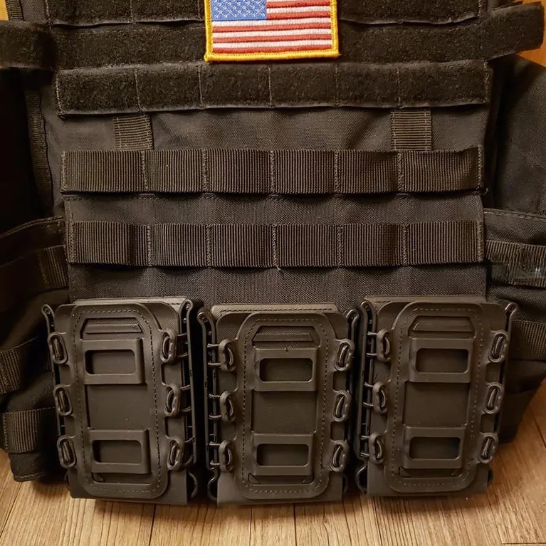 Elastyczne płyty TPR umieszczone z przodu i z tyłu stabilnie dociskają magazynek, zapewniając pewne trzymanie bez użycia klap czy gum, a jednocześnie umożliwiają błyskawiczne wyjęcie magazynka w sytuacjach wymagających dynamicznej reakcji.