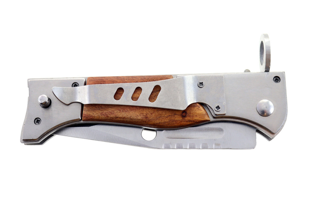 Bagnet otwiera się przy pomocy przycisku po lewej stronie noża oraz posiada blokadę zapobiegającą przypadkowemu otworzeniu lub zamknięciu.