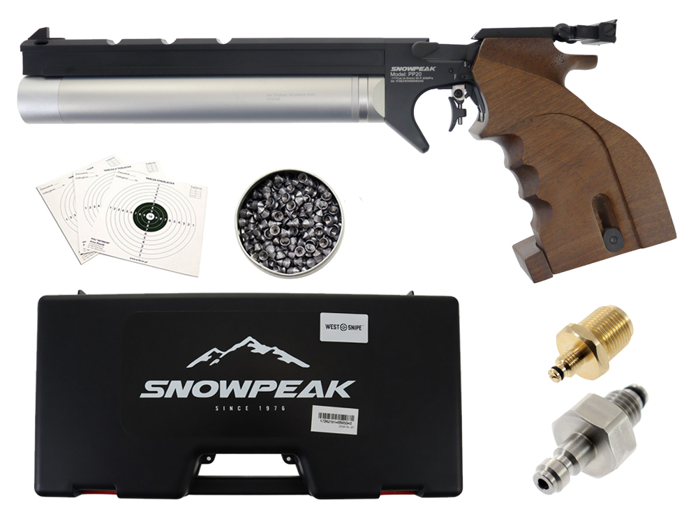 - pistolet PCP model PP20 - kaliber: 4,5 mm - w pełni regulowana szczerbinka - drewniany chwyt match - bezpiecznik - regulowany spust: 0,1-2 lbf (0,68-0,91 kg) - manometr zegarowy - regulator ciśnienia - zasilanie: kartusz na sprężone powietrze - wersja jednostrzałowa - waga: 1120 gram - długość całkowita: 420 mm - długość lufy: 240 mm - lufa gwintowana - prędkość początkowa: 170 m/s - energia kinetyczna poniżej 17 Jouli