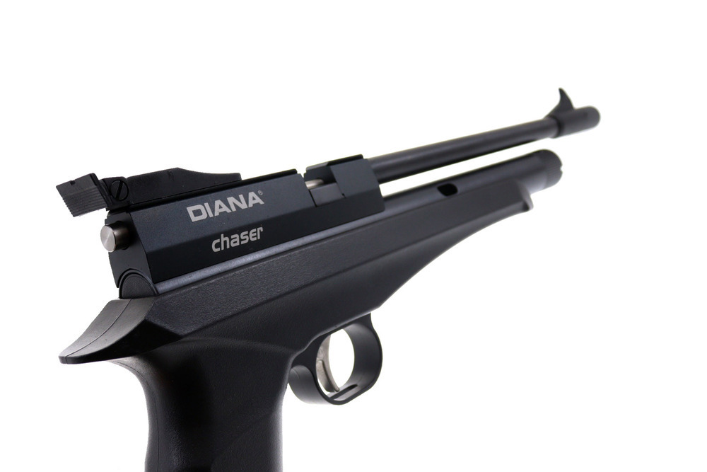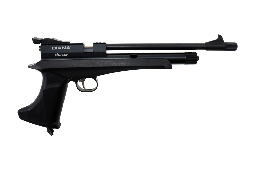 Wiatrówka Diana Chaser to model w którym pistolet został tak skonstruowany żeby w prosty i szybki sposób zmienić go na karabinek. Zmiana z pistoletu na karabinek polega na wymianie lufy (w komplecie są dwie) poprzez poluzowanie trzech śrub imbusowych oraz dokręceniu kolby. Należy również zdemontować szczerbinkę z pistoletu gdyż lufa karabinkowa została wyposażona we własną. Chaser został wyposażony wkładkę umożliwiającą oddanie pojedynczego strzału. Wiatrówka zasilana nabojem CO2 12 gram który umieszczamy w zasobniku pod lufą . Jeden nabój CO2 wystarcza na oddanie około 40 strzałów przy stałym ciśnieniu. Elementy konstrukcyjny pistoletu Diana Chaser jak lufa, zasobnik na co2 oraz spust zostały wykonane z metalu, co korzystnie wpływa na wytrzymałość oraz jakość produktu. Trwała i wytrzymała konstrukcja chwytu i kolby zapewnia łatwość zamiany z pistolety w karabinek oraz odwrotnie oraz ergonomię użytkowania Diana Chaser został wyposażony w szynę 11 mm, dzięki czemu jesteśmy wstanie zamontować kolimator lub w opcji karabinka lunetę.