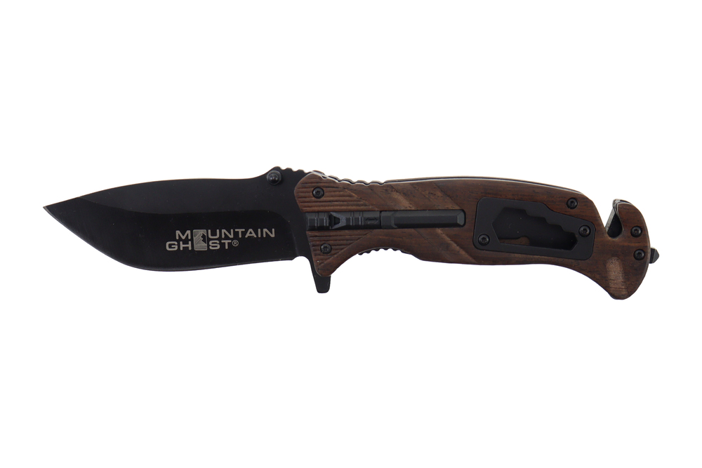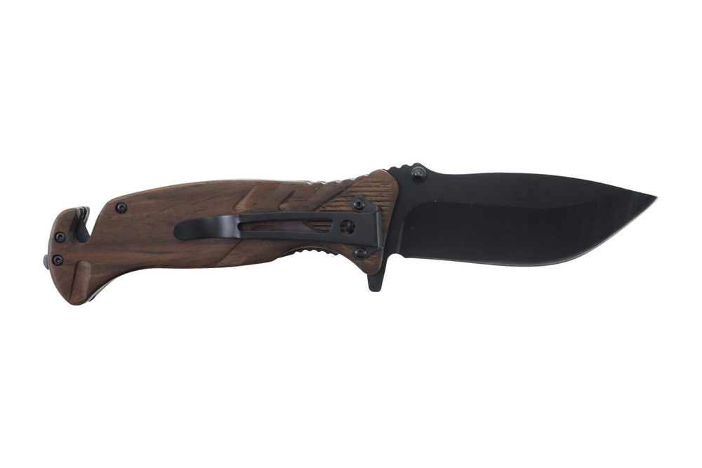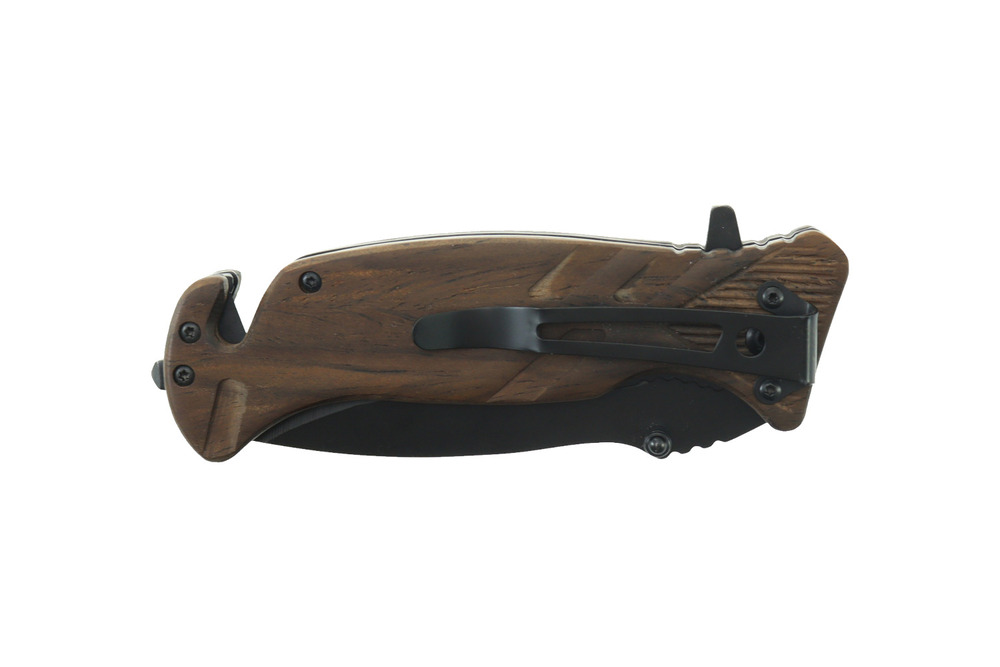 Nóż posiada klips montażowy, umożliwiający wygodne przenoszenie na pasku, kieszeni lub elementach oporządzenia.