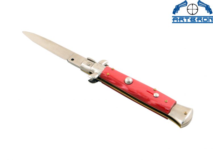 Nóż sprężynowy INOX. Posiada system otwierania jedną ręką przez naciśnięcie blokady. Otwiera się i automatycznie blokuje. Posiada blokadę niekontrolowanego otwarcia. Cały wykonany ze stali chromoniklowej.