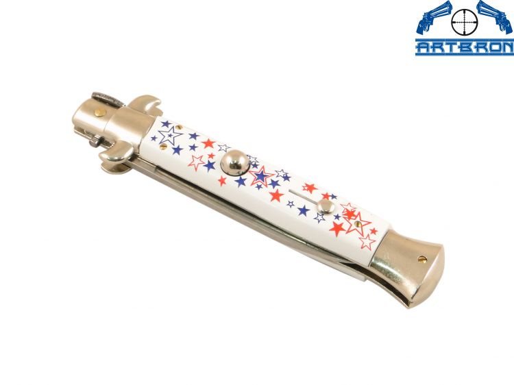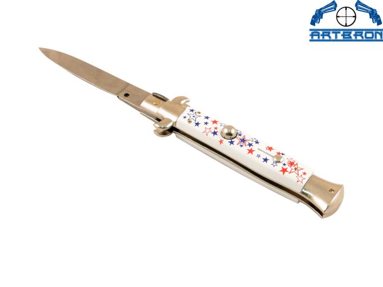 Nóż sprężynowy INOX. Posiada system otwierania jedną ręką przez naciśnięcie blokady. Otwiera się i automatycznie blokuje. Posiada blokadę niekontrolowanego otwarcia. Cały wykonany ze stali chromoniklowej.