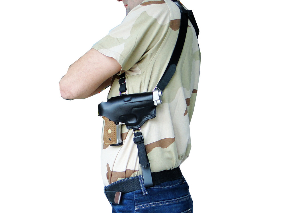 Skórzane szelki operacyjne do zamocowania kabury pod pachą.