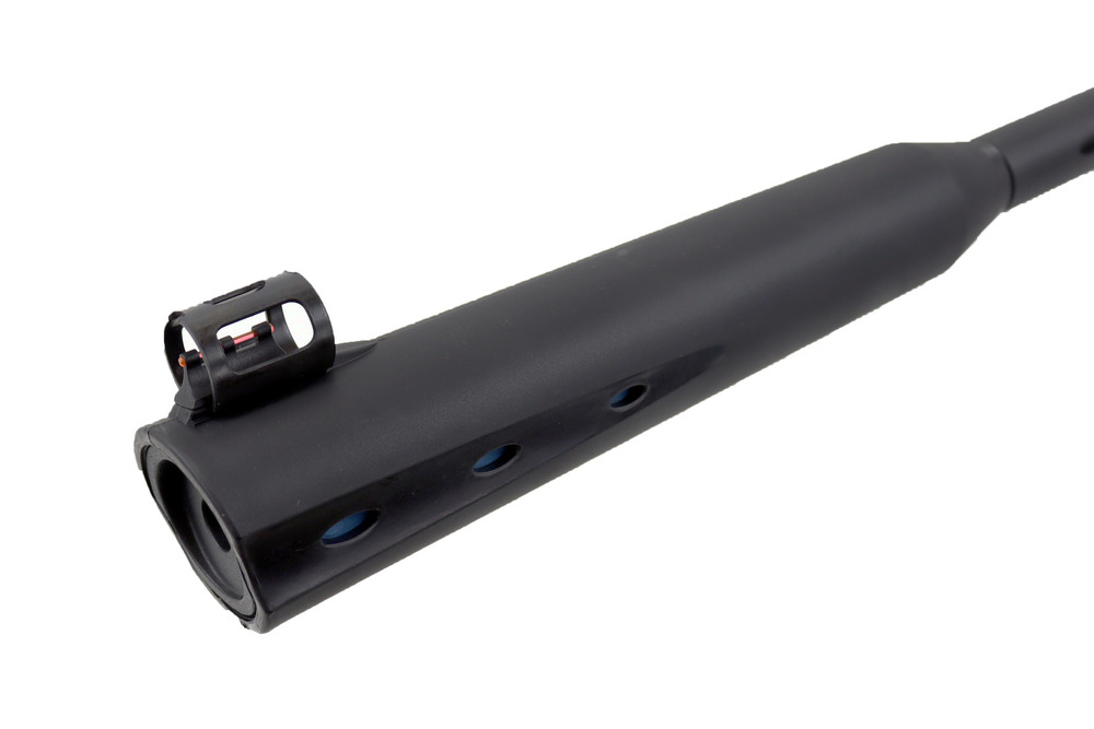 Zastosowana gwintowana lufa zapewnia dobre skupienie śrutu, a zintegrowany tłumik znacząco wycisza strzał. Dzięki temu strzelanie jest mniej uciążliwe dla użytkownika i nie przeszkadza w otoczeniu lub sąsiedztwie.