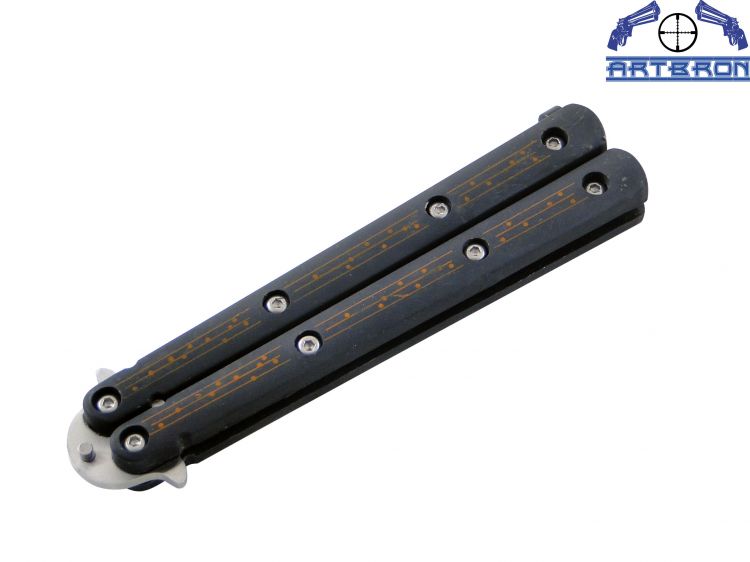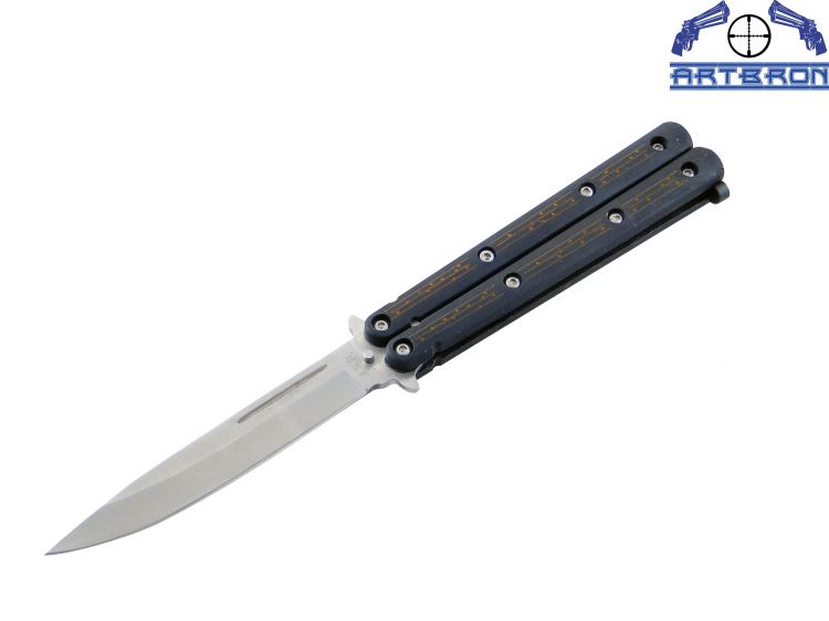 Solidnie wykonany, klasyczny nóż typu "motylek" z głownią clip-point, wykonaną ze stali nierdzewnej.