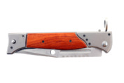 Nóż wykonany jest ze stali nierdzewnej z drewnianymi rękojeściami.