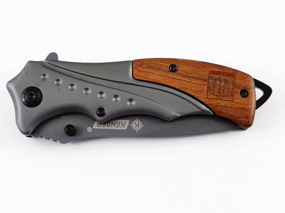 Koniec noża wyposażono w zbijak do szyb, rękojeść z jednej strony posiada wewnętrzną okłądzinę wykonaną częściowo z drewna.