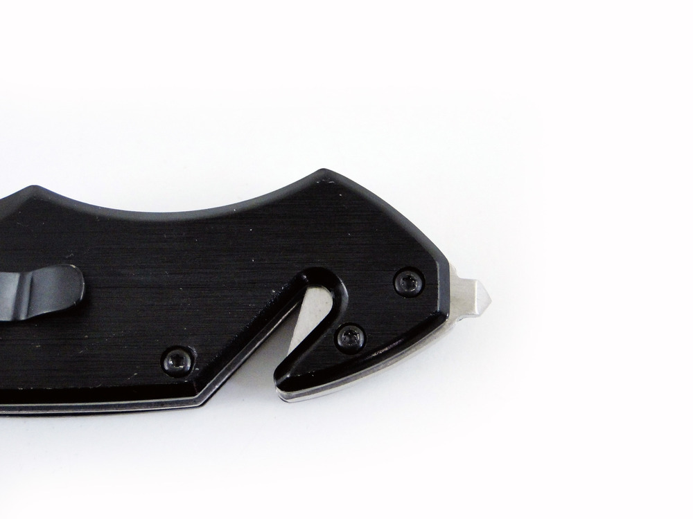 Koniec noża wyposażono w zbijak do szyb, rękojeść z dwóch stron posiada okłądzinę wykonaną ze szlifowanego duraluminium.