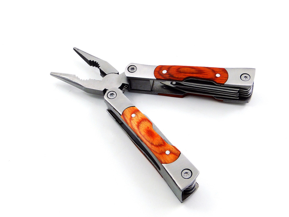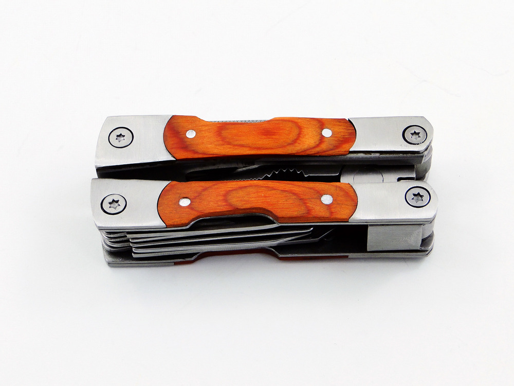 Szczypce wielofunkcyjne wykonane ze stali węglowej, okładziny rękojeści z drewnianymi wstawkami.