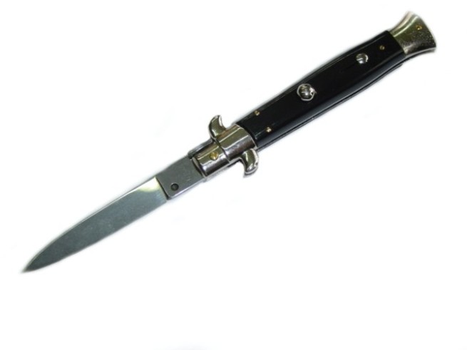 Nóż sprężynowy INOX. Posiada system otwierania jedną ręką przez naciśnięcie blokady. Otwiera się i automatycznie blokuje. Posiada blokadę niekontrolowanego otwarcia. Cały wykonany ze stali chromoniklowej.