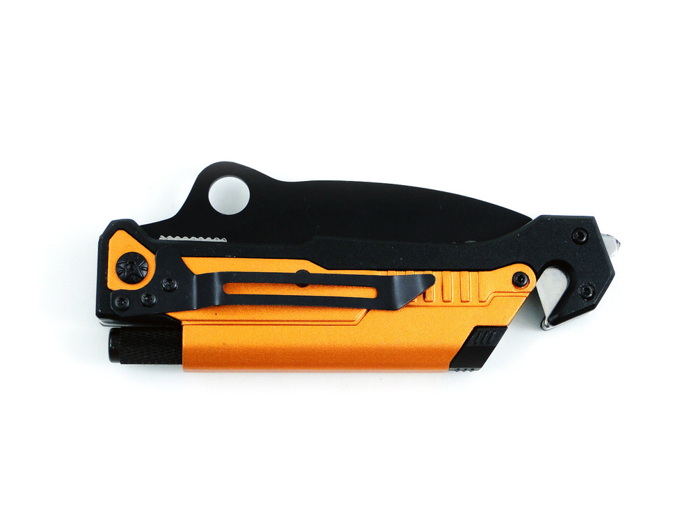 Model składany o surwiwalo ratowniczym przeznaczeniu. Może służyć zarówno do codziennego użytku jak i alternatywnie w sytuacjach jako nóż ratowniczy. Koniec zakończono zbijakiem do szyb. Dodatkowo posiada ostrze do cięcia twardych linek oraz rozcinania pasów bezpieczeństwa. Ostrze posiada możliwość otwarcia jedną ręką tradycyjnie kciukiem za pomocą otworu umieszczonego w ostrzu. Całość blokowana jest zaczepem liner lock. Ostrze ząbkowane pokryto powłoką galwaniczną w kolorze czarnym. Zaokrąglona końcówka ostrza pozwala zachować bezpieczeńswto podczas użytkowania. Rękojeść wyposażono w wygodny zaczep umożliwiający przypięcie noża do paska lub spodni. Nóż wyposażony jest w wyjmowaną latarkę led. Latarka zakończona jest magnesem dzięki czemu można łatwo przymocować ją np. do spodu klapy samochodowej. Dodatkowo do noża dołączone krzesiwo które razem z latarką jest zintegrowane z rękojeścią noża i łatwo dostępne do wyjęcia.
