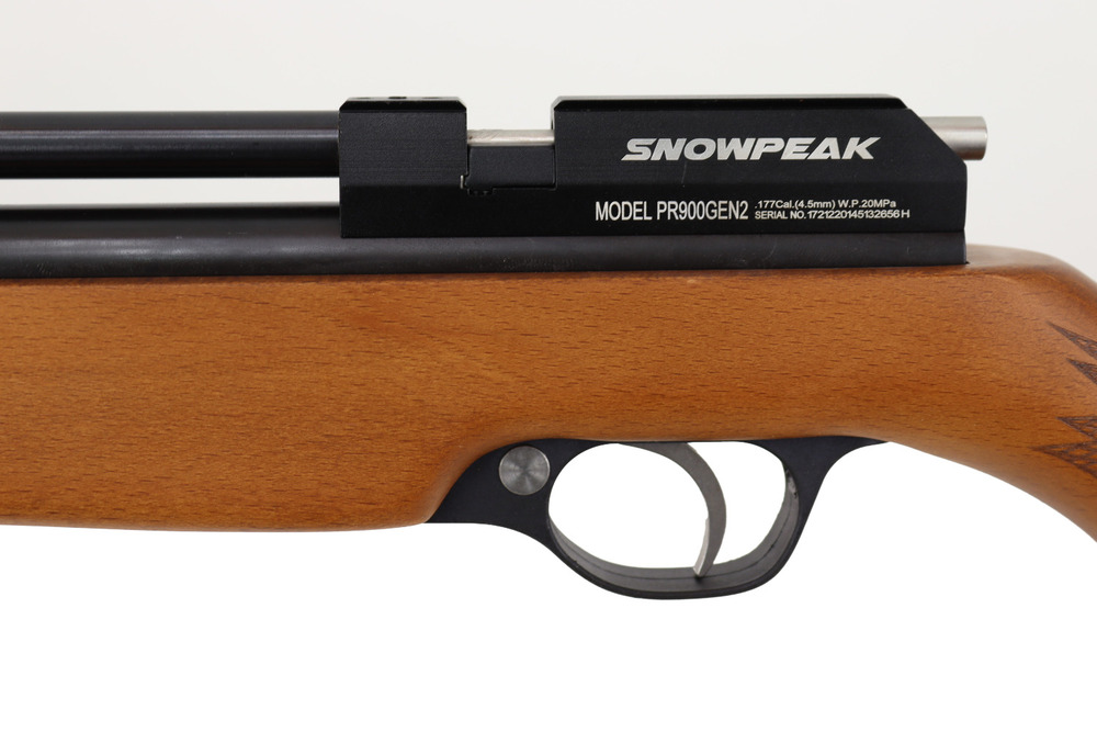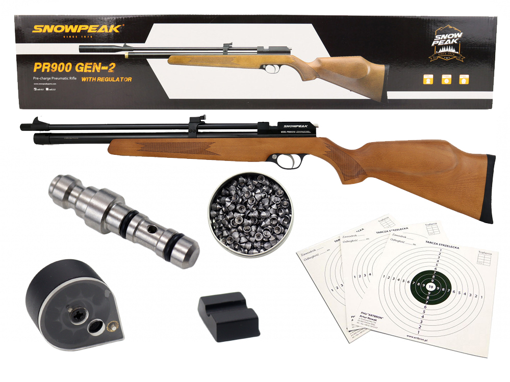 - model: Snow Peak PR900 wood gen. II - kaliber: 5,5 mm - zasianie: kartusz na sprężone powietrze - szyna montażowa 11 mm - magazynek ośmioostrzałowy lub wkładka jednostrzałowa - waga: 2200 gram - długość całkowita bez tłumika: 910 mm - długość całkowita z tłumikiem: 1025 mm - długość lufy: 450 mm - lufa gwintowana - przeładowanie za pomocą rygla odtylcowego - prędkość początkowa: 190 m/s - regulacja twardości spustu (od 2,2N do 17,8N) - energia kinetyczna poniżej 17 Jouli