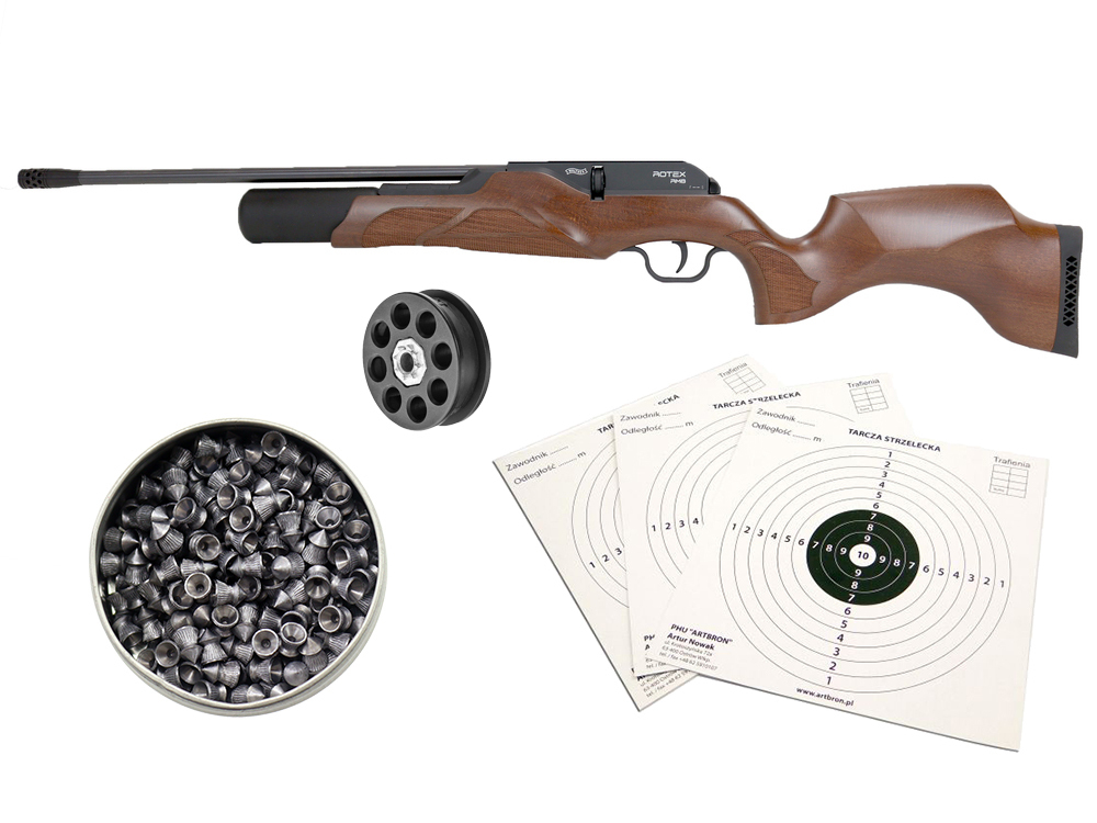 W zestawie znajduje się magazynek, który mieści w sobie 8 sztuk śrutu ołowianego w kalibrze 4,5 mm. Podczas czterotaktowego przeładowania magazynek obraca się, umożliwiając załadowanie kolejnego śrutu do lufy.