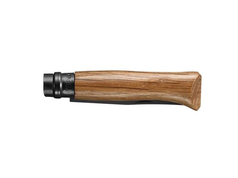 Tradycyjny składany nóż Opinel. Ergonomiczna rękojeść wykonana jest z lakierowanego drewna dębowego. Głownia (dł. 8,5 cm) wykonana jest z nierdzewnej i modyfikowanej stali Sandvik 12C27. Jej ostrze zapewnia bardzo dobre właściwości tnące. Nóż wyposażony jest w system blokady Virobloc- blokuje on głownię w stanie otwartym lub zamkniętym.  Głownia i pierścień są pokryte specjalną powłoką w czarnym kolorze. Nakładana jest ona metodą elektrolityczną, która zwiększa odporność na korozję.