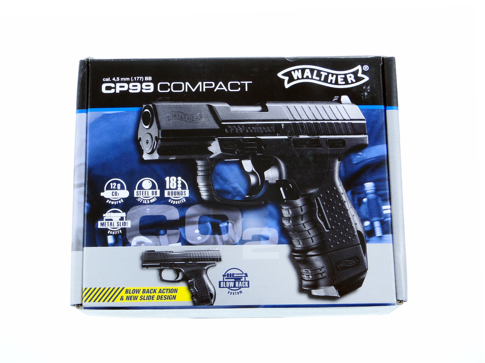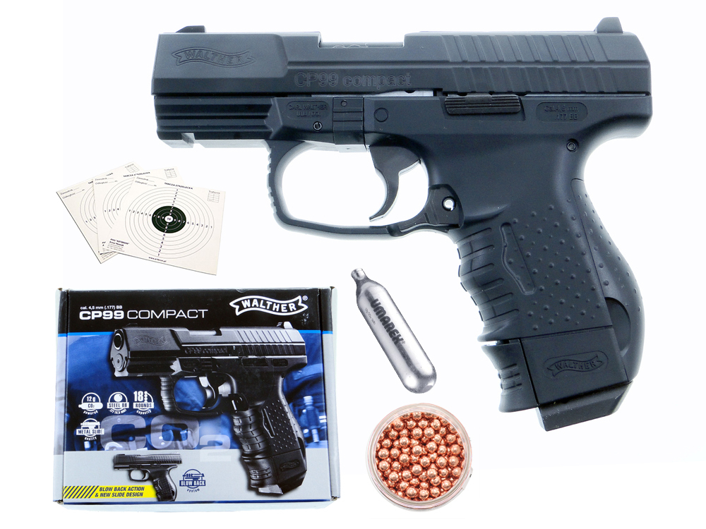 Walther CP99 Compact 4,5 mm BB CO2 to wierna replika pneumatyczna pistoletu bezkurkowego Walther P99 używanego przez polską Policję. Wiatrówka jest wyposażona w solidny metalowy zamek oraz realistyczny system blow-back. Dodatkowo, posiada powiększony kabłąk, obustronną dźwignię zatrzasku magazynka, metalowy magazynek wysuwany z rękojeści, a także profilowaną rękojeść. Wszystko to tworzy doskonale wykończoną i spasowaną konstrukcję, idealną dla rekreacyjnego strzelania.