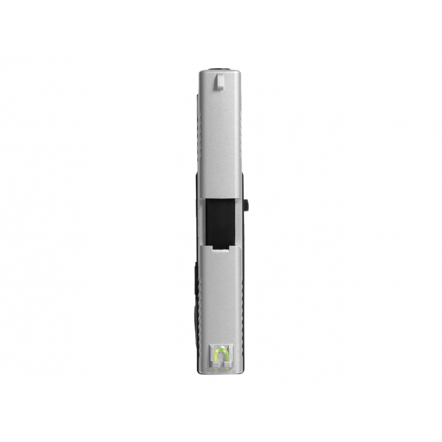Pistolet ma ruchomy metalowy zamek, który można przeładować w identyczny sposób jak w broni palnej.