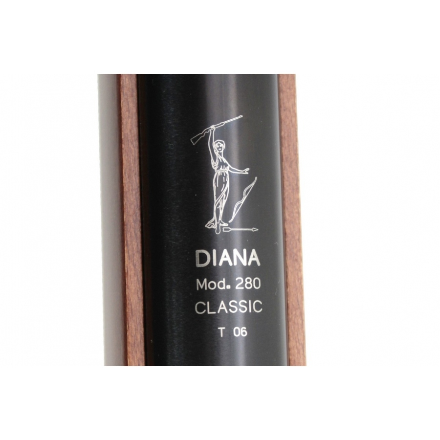 Model: 280 Classic T06 Kaliber: 4,5 mm Energia kinetyczna: poniżej 17 J Prędkość początkowa: około 240 m/s (JSB Exact 0,547 grama) Długość całkowita: 1080 mm Długość lufy: 440 mm Wagaz bez lunety: 3250 gram Producent: Diana, Niemcy