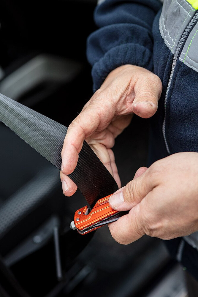 Rękojeść z klipsem do przenoszenia noża wykonano z anodowanego aluminium, jest trwała i odporna na korozję. Specjalne ostrze- przecinak w rękojeści, umożliwia przecięcie pasa, linki.